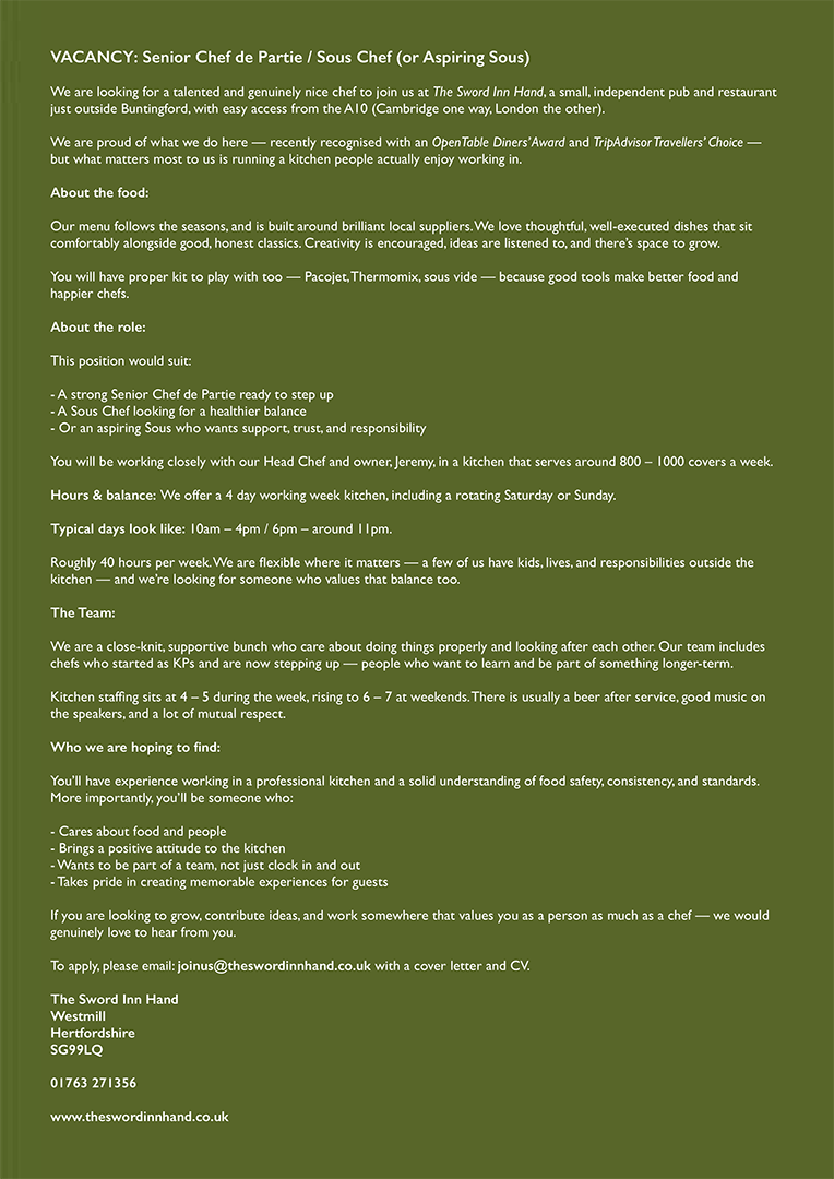The Sword Inn Hand is a 14th Century free house nestled in the beautiful rural Hertfordshire village of Westmill, a mile south of the market town of Buntingford. With bar, dining room, mature landscaped gardens and charming country inspired guest rooms, it is the perfect countryside retreat for drinking, dining and relaxing. Seasonal produce is delivered to us daily by our fantastic local suppliers, and we pride ourselves on serving delicious fine food and traditional ales. Our friendly yet professional customer service and warm, relaxing atmosphere inspires our lovely customers to return week after week, and welcomes new visitors from far and wide.