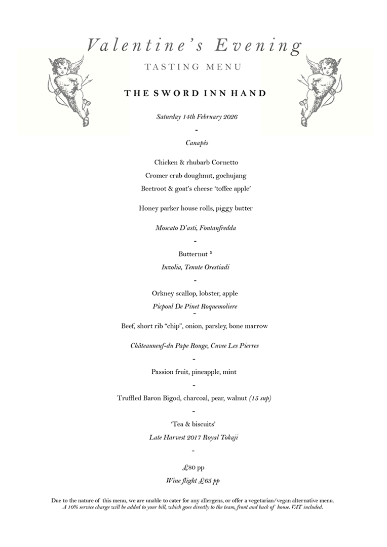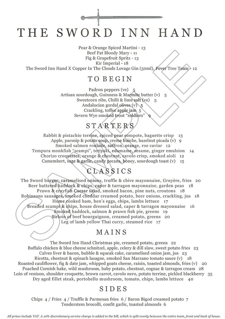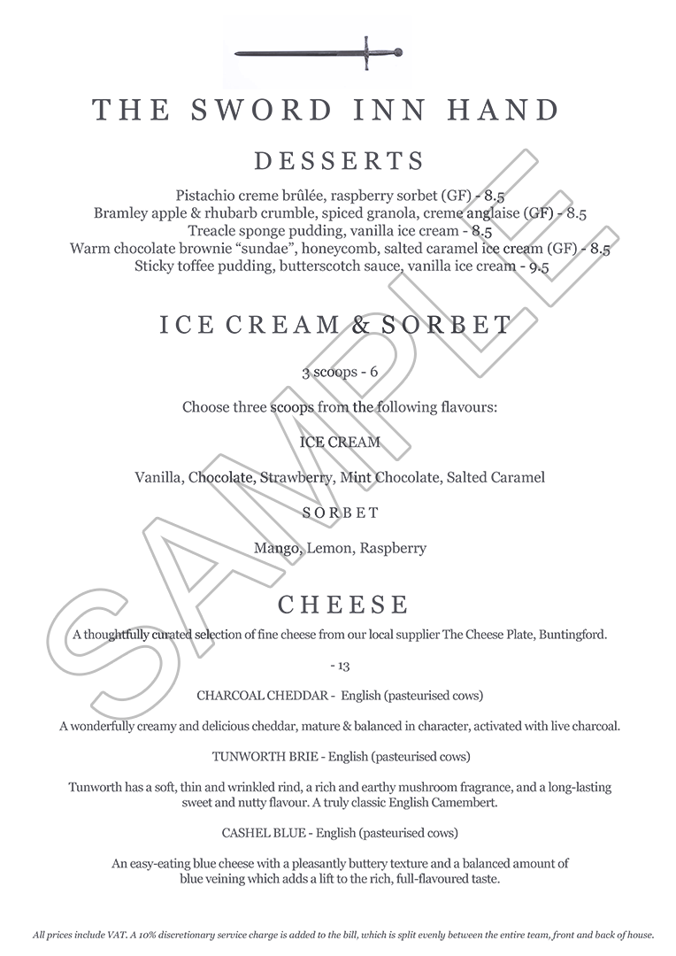 At The Sword Inn Hand our talented team of chefs create fine, tempting seasonal dishes created from fresh locally sourced produce. Our menu is varied to offer something for every taste, please take a look at our sample menus for inspiration.
